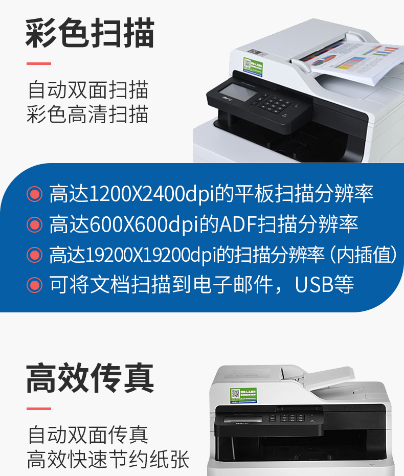 幅面A4,黑彩同速:22页/分·3.7英寸彩色触摸式液晶屏·支持仅黑白打印支持35页双CIS自动输稿器,双面打印复印 彩色激光无线多功能一体机打印复印扫描传真