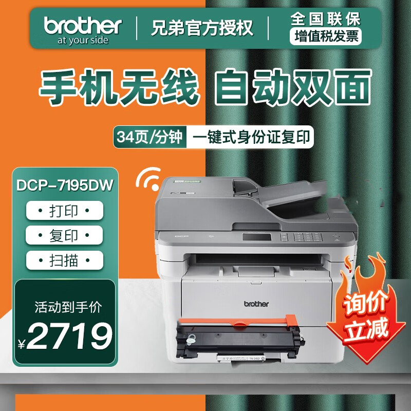 兄弟(brother)DCP-7195DW 黑白激光一体机 (打印 复印 扫描 双面打印 无线网络)