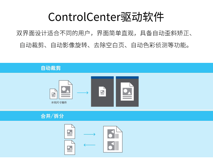 双界面设计适合不同的用户,界面简单直观,具备自动歪斜矫正、自动裁剪、自动影像旋转、去除空白页、自动色彩侦测等功能。