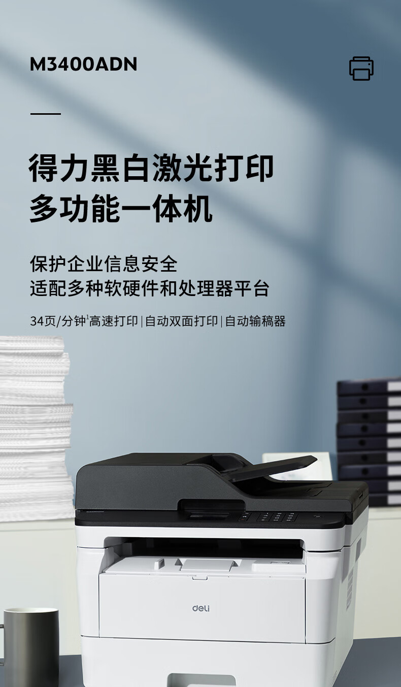 得力(deli) 得力M3400ADN黑白激光打印 复印 彩色扫描 A4自动双面商用办公多功能一体机
