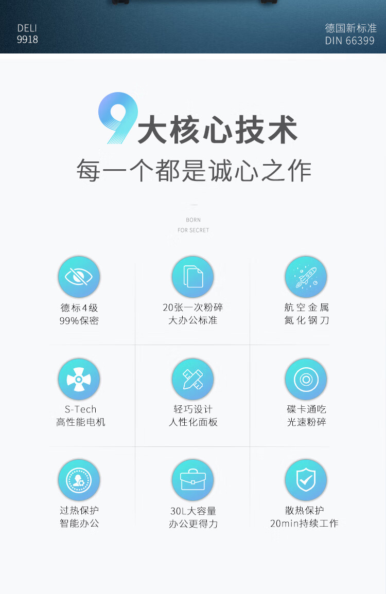 得力(deli)4级保密专业办公碎纸机(单次20张 30L 持续20分钟 可碎卡碎光盘)9918