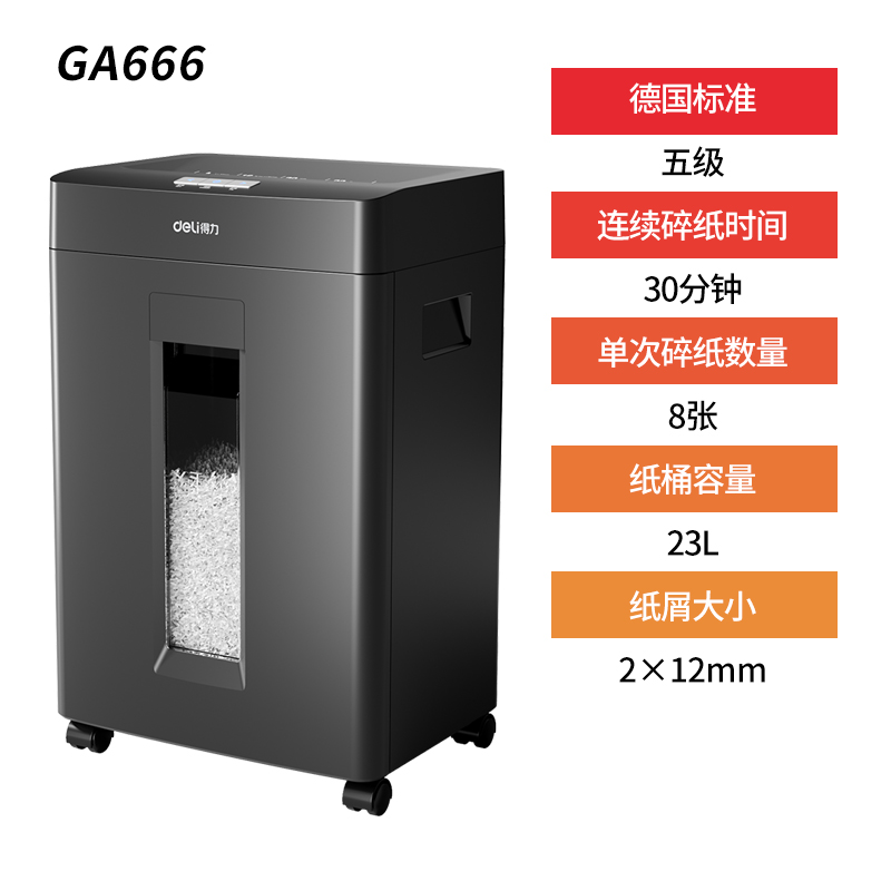 得力碎纸机5级高保密 大型文件粉碎机电动商用办公碎纸机 8张 30分钟 23L大容量 GA666