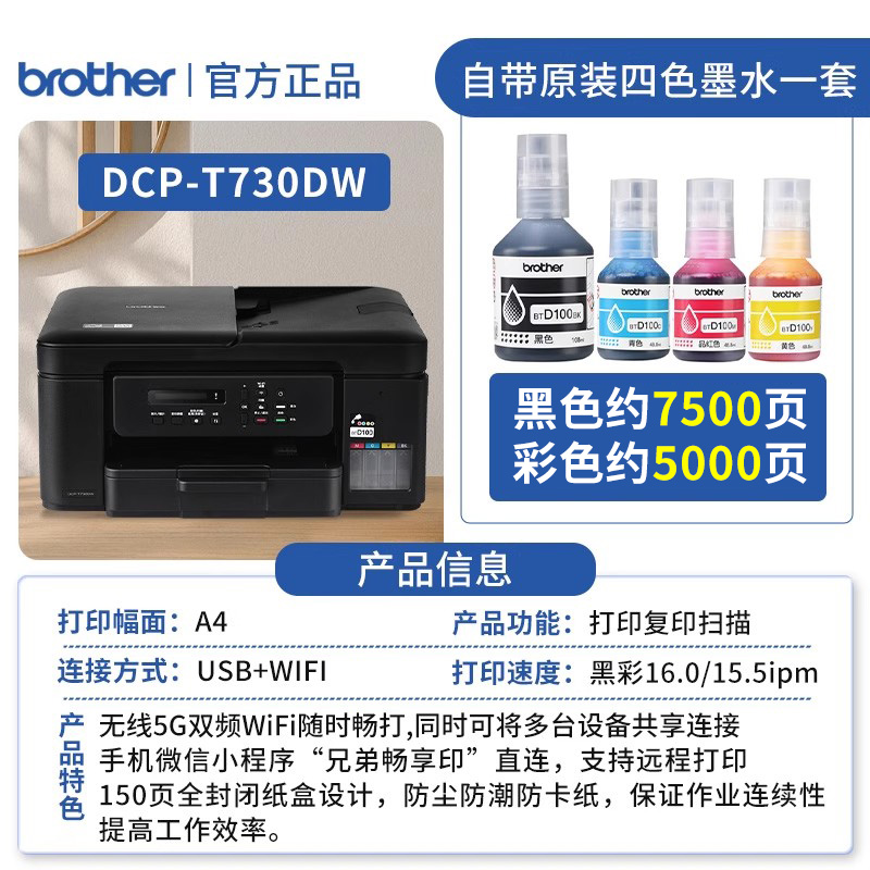 兄弟DCP-730DW彩色喷墨自动双面打印作业无线5G复印扫描一体机 730DW(5G远程双面打+输稿器)