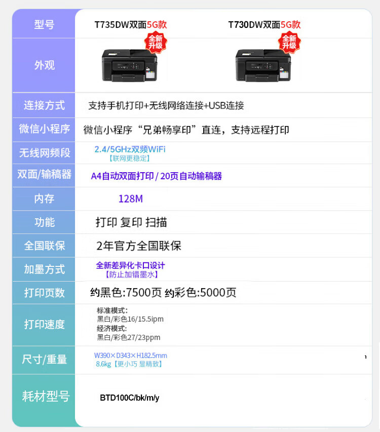 兄弟DCP-730DW彩色喷墨自动双面打印作业无线5G复印扫描一体机 730DW
