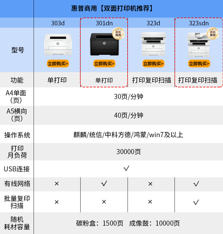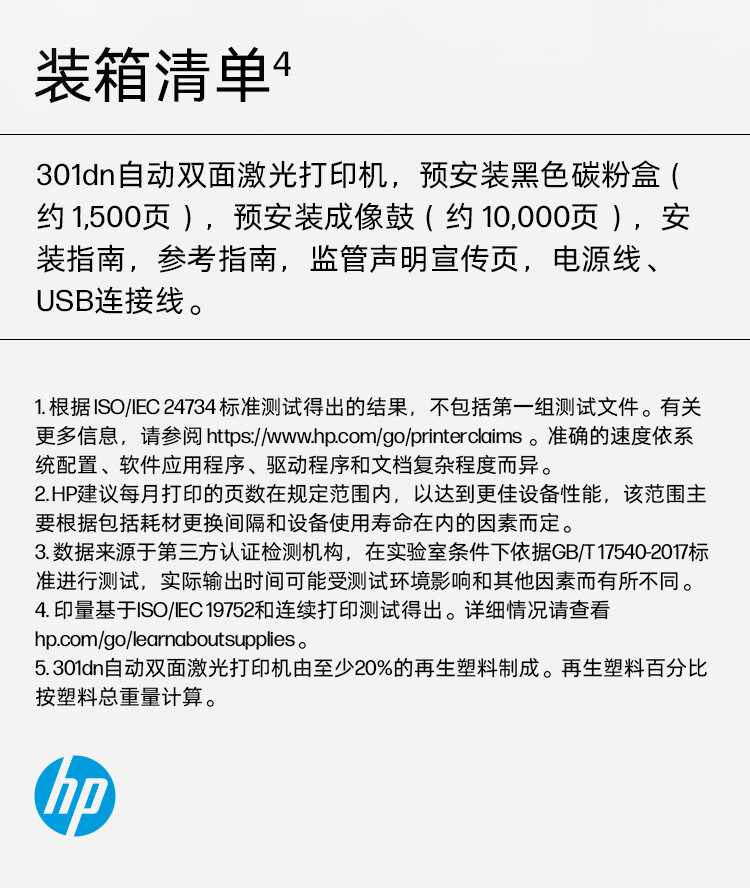 惠普(HP)301dn 自动双面有线激光打印机 不干胶铜版纸卡片纸双纸路打印 捷系列 一年原厂上门服