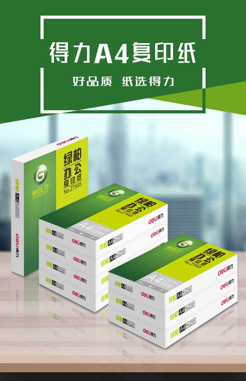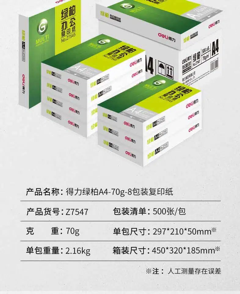 deli得力deli绿柏复印纸打印白纸木尚A4 70g整箱白纸500张/包办公用纸 绿柏70克A4-8包 绿柏70克A48包