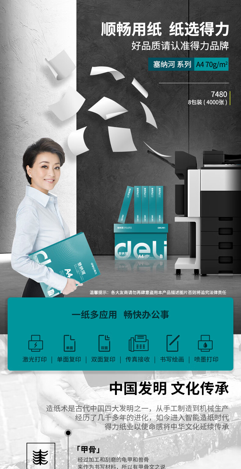 得力塞纳河A4复印纸70g整箱8包装打印纸单包500张白纸草稿纸批发 (得力塞纳河70克)一箱8包4